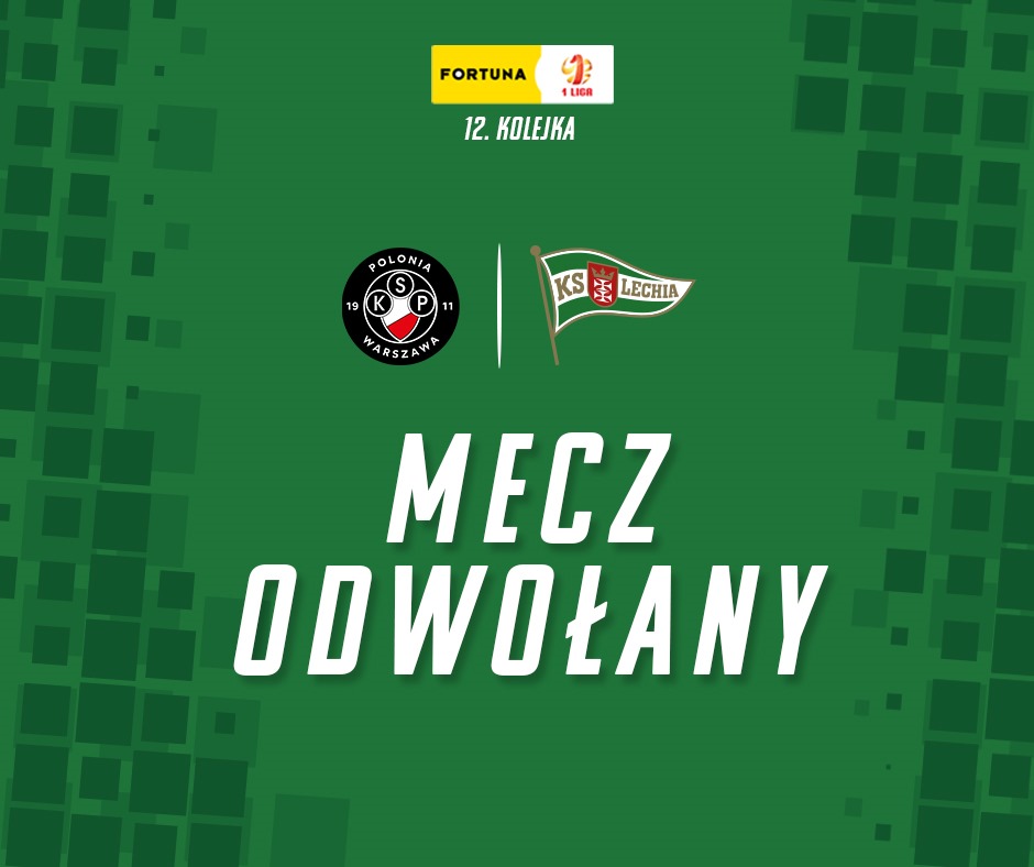 Zaplanowany na niedzielę (22 października) mecz 12. kolejki Fortuna 1. Ligi – Polonia Warszawa vs. Lechia Gdańsk został odwołany. Nowy termin rywalizacji nie jest jeszcze znany.