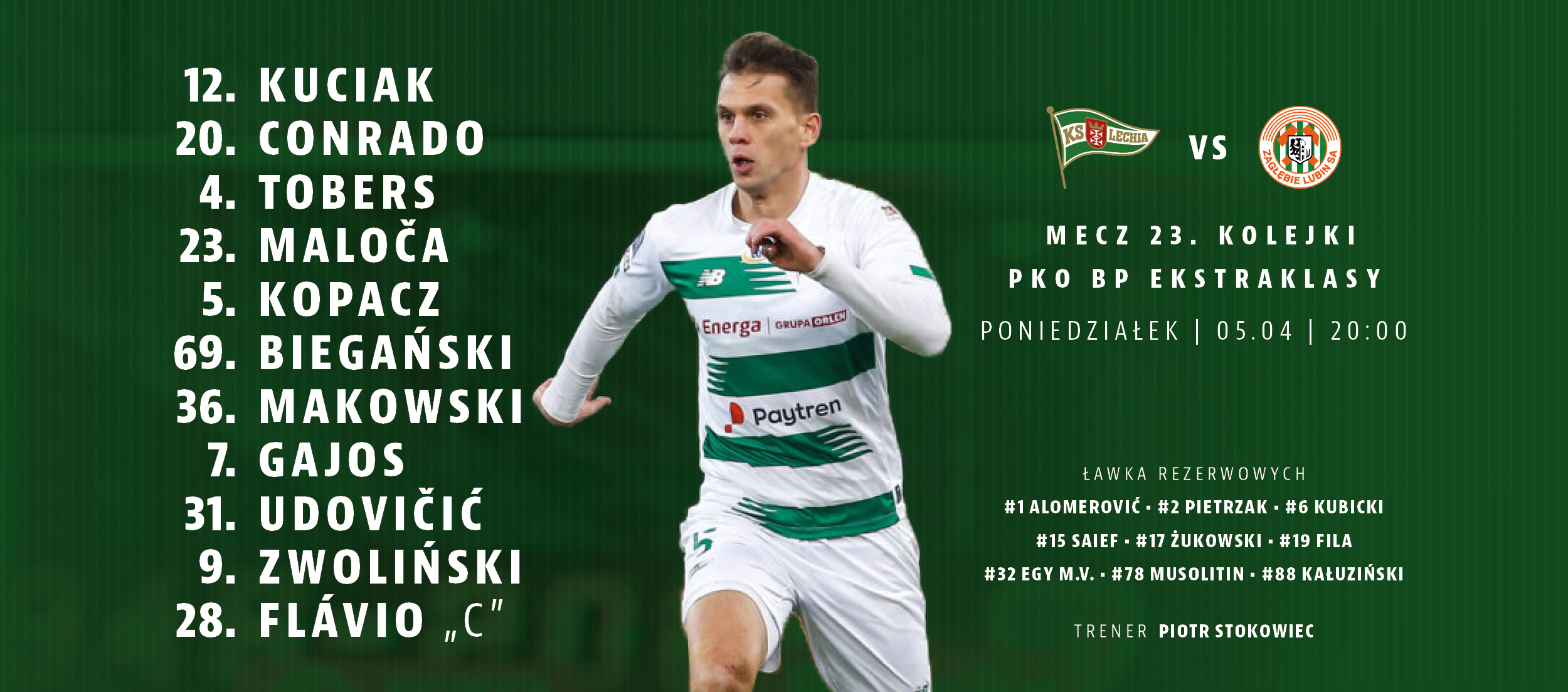 Poznaliśmy wyjściowy skład Biało-Zielonych, w jakim rozpoczną spotkanie z Zagłębiem Lubin. Początek meczu o godzinie 17.30.